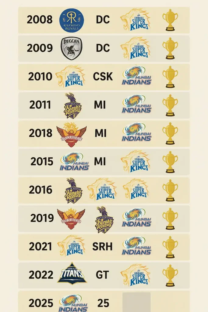 2008 | Rajasthan Royals | 22 | Deccan Chargers | 6 |