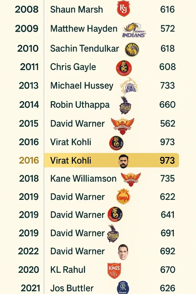 Table 1: Full Orange Cap List — IPL 2008 to 2025
