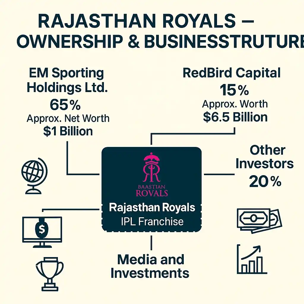 The Emerging Media IPL Ltd holds the fundamental ownership of Rajasthan Royals, which is controlled by Manoj Badale, a UK-based British-Indian businessman. As of 2025, Badale is projected to have over 65% ownership in the franchise, making him the key decision maker for off-field strategy and planning for the Royals.